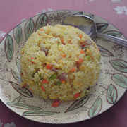 瘦肉、虾、青椒、胡萝卜、鸡蛋、米饭、咖喱粉。