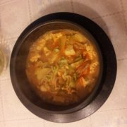 猪五花肉片、大豆腐、西葫芦、土豆、豆芽、金针菇、大虾、青尖椒圈、韩国大酱、韩国辣酱。