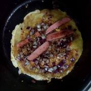 高筋面粉、玉米粉、大豆油、鸡蛋、洋葱、香菜、糖、陈醋、辣椒粉 孜然粉 白芝麻 盐混合为烧烤粉、甜辣酱(可以换成自己喜欢的酱)、火腿肠。