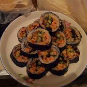 海苔、糯米珍珠米饭、黄瓜、火腿肠、海带丝、榨菜、甜面酱、烤鳕鱼。