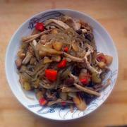 泡菜、五花肉、茶树菇、鸡腿菇、粉条、葱姜蒜末、盐、酱油、料酒、味精。