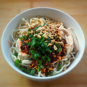 面条、鸡胸肉、黄瓜、香葱、花生碎、蒜末、姜末、盐、糖、酱油、豆豉、花椒面、油泼辣子、醋。