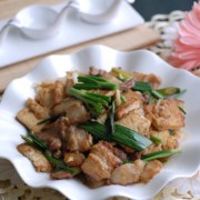 豆腐、腩肉、葱、蒜、姜、盐、蚝油、鸡粉、生抽、糖、生粉、香麻油。