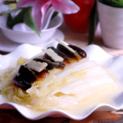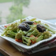花菜、冬菇、胡萝卜、蒜、盐、糖、鸡粉、香麻油、生粉。