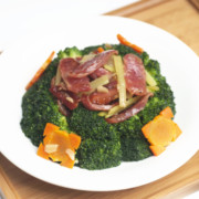 西兰花、腊肠、腊肉、胡萝卜、蒜、盐、鸡粉、糖、生粉。
