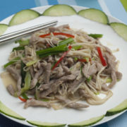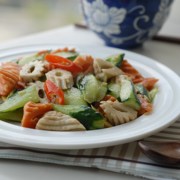 青瓜、鱼卷、姜、蒜、红椒、盐、鸡粉、糖、蚝油、胡椒粉、生粉。
