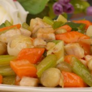 鲜虾、胡萝卜、西芹菜、瘦肉、益智、茭头、彩椒、蒜、葱、盐、鸡粉、白糖、生粉。