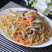 意大利面、瘦肉、胡萝卜、尖椒、洋葱、葱、蒜、盐、糖、鸡粉、生抽、香麻油。