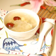 红枣、白莲、雪耳、椰子汁、冰糖、白糖、藕粉。