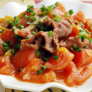 番茄、牛肉、香芹菜、蒜、葱、茄汁、盐、白糖、鸡粉、生粉。