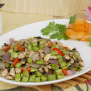 橄榄菜、瘦肉、四季豆、蒜、红椒、洋葱、盐、鸡粉、蚝油、白糖、生粉、香麻油。