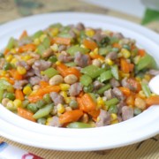 青豆、玉米、胡萝卜、瘦肉、花生、西芹、蒜、盐、鸡粉、生粉、香麻油。