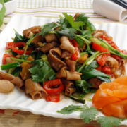 鹅肠、葱、姜、蒜、红椒、蒜苗、香菜、盐、鸡粉、糖、生粉、香麻油、蚝油、生抽、老抽。