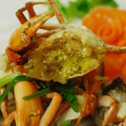 螃蟹、姜、葱、蒜头、糖、蚝油、鸡粉、生抽、料酒、生粉、胡椒粉。