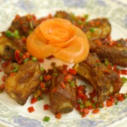 排骨、红椒、葱、青椒、蒜、椒盐粉、生抽、鸡粉、料酒、盐、辣椒酱、辣椒油。