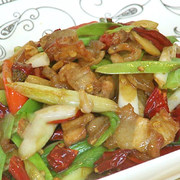 五花肉、蒜苗、小米椒、姜片、蒜片、辣椒干、生抽、料酒、蚝油、老抽、生粉、辣椒油。