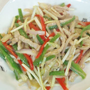 猪肉、土豆、青椒、红椒、葱白、姜片、盐、鸡粉、糖、料酒、生抽。