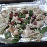 鸡胸肉、香肠、花椰菜、甜椒、盐、酒、生抽、肉桂粉、五香粉、胡椒粉、蜂蜜。