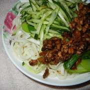 面条、肉丁、黄瓜、青菜、虾皮、香菇、海天辣黄豆酱、生姜、蒜子。