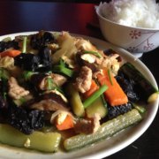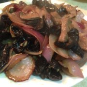 小猪里脊肉、黑木耳、黄瓜、胡萝卜、香菇、大葱、鸡蛋、鸡粉。