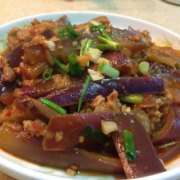 紫色茄子、瘦肉、姜、蒜、葱、四川豆瓣酱。