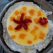鸡蛋、低筋面粉、玉米胚芽油、鲜牛奶、细砂糖、自制酸奶、吉利丁片、牛奶、动物性淡奶油、芒果粒、香橙。