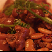 猪蹄、芸豆、郫县豆瓣、姜蒜粒、葱段、五香粉、老抽、花椒。