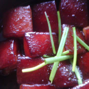 猪五花肉、黄酒、老抽、八角、冰糖、老姜、葱。