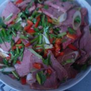 熟牛肉、香菜、红辣椒、葱、香油、五香粉。