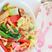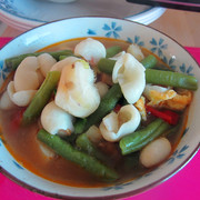 猫耳朵、豆角、土豆、红薯、西红柿、鸡毛菜、瘦肉、豆干、大葱、生抽、盐、植物油、鸡精、鸡汁。