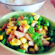 玉米、杏鲍菇、青椒、葱段、姜末、麻椒、蚝油、糖、盐、生抽、鸡精、植物油。