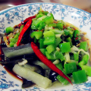茄子、青椒、葱、姜、蒜、花椒、盐、糖、生抽、醋、鸡精、辣椒油。