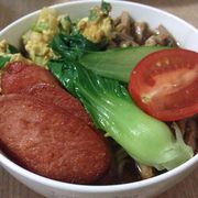 肉丝、鸡蛋、面条、小葱、姜、油菜、圣女果。