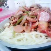 面条、瘦肉、蘑菇、青椒、紫洋葱、火腿、茄汁黄豆、西红柿、盐、鸡精、番茄酱、烧烤料、黑胡椒粉。