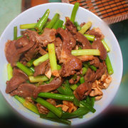 猪心、蒜薹、青椒、姜、蒜、香油、盐、老抽、生抽、料酒、胡椒粉、淀粉、味精。