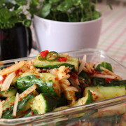 黄瓜、洋葱、小红辣椒、小青椒、蒜末、姜丝、辣椒粉、精盐、白糖。