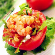 番茄、虾、萝卜、生菜、洋葱、黄瓜、番茄酱、橄榄油、大蒜茸。
