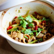 肥肠、干辣椒、花椒、尖椒、芹菜、香叶、八角、香葱、姜。