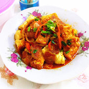豆腐、香肠、油、盐、红辣椒、大蒜、香葱、郫县豆瓣酱、生抽、白糖、白胡椒粉、水淀粉。