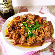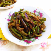 茄子、豇豆、猪肉、油、盐、蒜末。