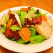 腊肉、杏鲍菇、西芹、青蒜、姜、油、盐、鸡粉、料酒。