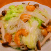 海米、蟹味菇、粉丝、白菜、葱花、姜丝、鸡粉、油、盐。