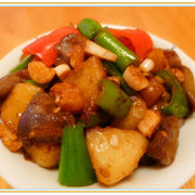 茄子、土豆、青椒、葱、姜、蒜、海米、蚝油、生抽、香醋、香葱、盐、糖、五香粉、香油、鸡粉、鸡粉。