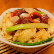 茄汁、青辣椒、红辣椒、葱、蒜、油、盐、生抽、老抽、醋、糖、香油、生粉、鸡粉。