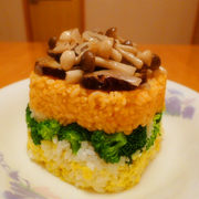 白饭、红萝卜、西兰花、玉米、真姬菇、鲜冬菇、海鲜菇、洋葱、橄榄油、料酒、清汤、盐。