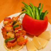 鲜虾、青口、带子、三色椒、洋葱、番茄、芦笋、黄瓜。