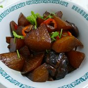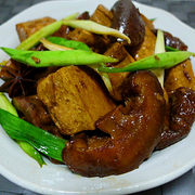 实豆腐、干香菇、青蒜、葱花、姜末、蒜末、八角料、花椒、桂皮、鸡粉、老抽、料酒。