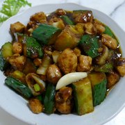 鸡柳、黄瓜、花生米、甜面酱、油、蚝油、料酒、葱、姜、蒜、胡椒粉、糖。