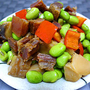 腊肉、青豆、干冬菇、红辣椒、油、鸡粉、盐、姜末。