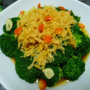 西兰花、干贝、蒜、上汤、生粉、花雕酒、生抽、糖。